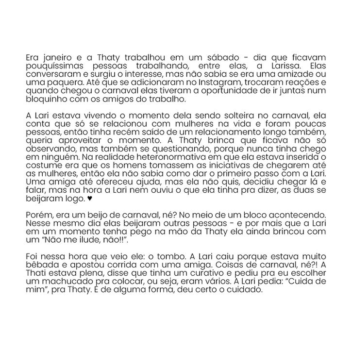 A Lari estava vivendo o momento dela sendo solteira no carnaval, ela conta que só se relacionou com mulheres na vida e foram poucas pessoas, então tinha recém saído de um relacionamento longo também, queria aproveitar o momento. A Thaty brinca que ficava não só observando, mas também se questionando, porque nunca tinha chego em ninguém. Na realidade heteronormativa em que ela estava inserida o costume era que os homens tomassem as iniciativas de chegarem até as mulheres, então ela não sabia como dar o primeiro passo com a Lari. Uma amiga até ofereceu ajuda, mas ela não quis, decidiu chegar lá e falar, mas na hora a Lari nem ouviu o que ela tinha pra dizer, as duas se beijaram logo. ♥