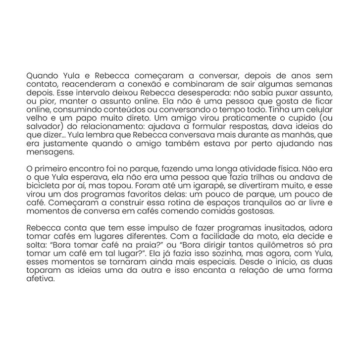Quando Yula e Rebeca começaram a conversar, depois de anos sem contato, reacenderam a conexão e combinaram de sair algumas semanas depois. Esse intervalo deixou Rebeca desesperada: não sabia puxar assunto, ou pior, manter o assunto online. Ela não é uma pessoa que gosta de ficar online, consumindo conteúdos ou conversando o tempo todo. Tinha um celular velho e um papo muito direto. Um amigo virou praticamente o cupido (ou salvador) do relacionamento: ajudava a formular respostas, dava ideias do que dizer… Yula lembra que Rebeca conversava mais durante as manhãs, que era justamente quando o amigo também estava por perto ajudando nas mensagens.